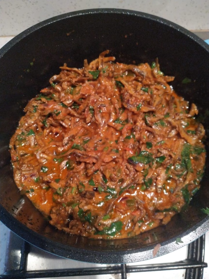 Get an image to deep fry and open it (duh xd). 200 g unga, 250 g deep fried fresh omena, sukuma wiki (chopped), 4 tomatoes, 4 onions, royco mchuzi mix, salt, cooking fat/oil. Do not put water in hot oil. Chop the tomatoes into the cooked onions. Chop 2 onions into the hot cooking oil and stir until golden brown.